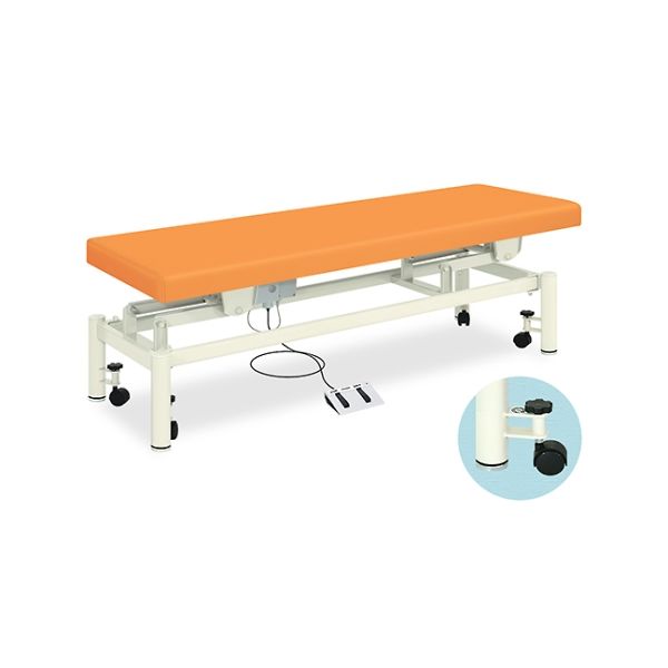 商品の特徴 ●女性でも簡単に調節できる移動に便利な直径5cmレベルキャスター。●電動旋回昇降式で高さを調節できるフットスイッチ操作の電動施術台。●静音性&耐久性の高品質なハイパワー電動アクチュエーターを採用。●アジャスター付き