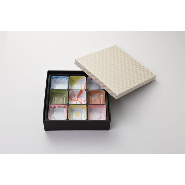本体 仕様 内側:白ボール紙 / 外側底面:上げ底・白ボール紙 寸法 内寸:幅205mm×奥行き205mm×高さ43mm、外寸:幅215mm×奥行き215mm×高さ58mm