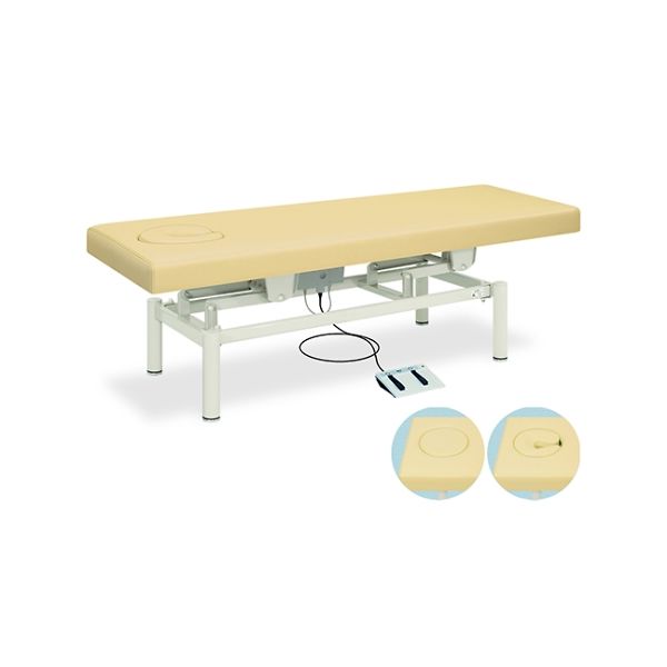 | 商品の特徴 | ●脚部フレームを内側に加工して施術効率を優先したコンパクト設計。●埋込式ケアーフェイスマット(TB-77C-28)&埋込式無孔マット付き。●電動旋回昇降式で高さを調節できるフットスイッチ操作の電動施術台。●アジャスター付き | ||