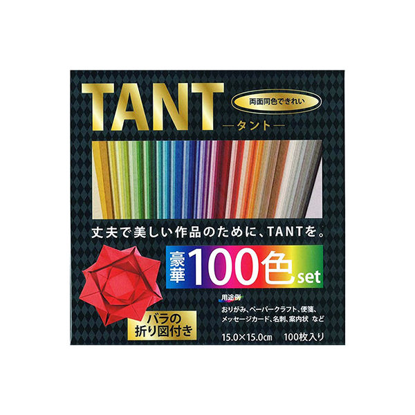 「丈夫で美しい作品のために、TANTを。」両面同色、しっかりとした紙質で、美しく丈夫に仕上がります。創作の幅が広がる豪華100色セット。15×15cm、100枚入り。