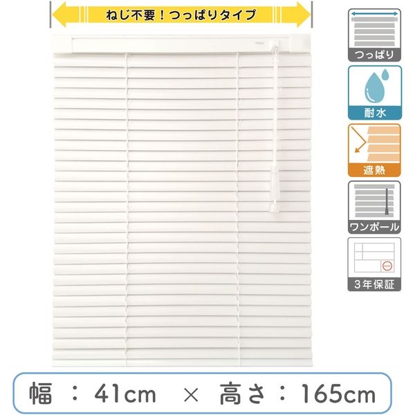 | 商品の特徴 | ブラインドは長く使うからこそしっかりとこだわったプロ仕様品質をそのままに、機能をシンプルにすることで格安価格を実現しました。遮熱加工済みで羽根幅は標準の25mm。取付けはネジのいらない【つっぱりタイプ】なのでタイル面でもご利用可能です。また耐水機能付きなので、サビやカビが気になる湿気の多い場所にもおすすめです。 | ||
