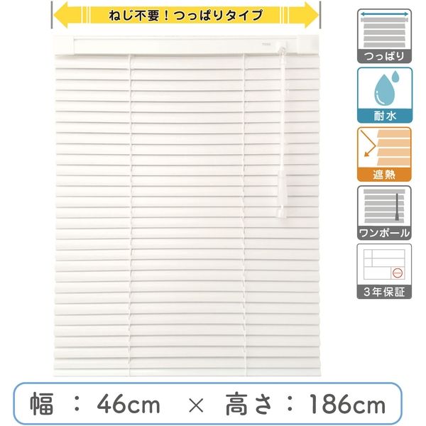 | 商品の特徴 | ブラインドは長く使うからこそしっかりとこだわったプロ仕様品質をそのままに、機能をシンプルにすることで格安価格を実現しました。遮熱加工済みで羽根幅は標準の25mm。取付けはネジのいらない【つっぱりタイプ】なのでタイル面でもご利用可能です。また耐水機能付きなので、サビやカビが気になる湿気の多い場所にもおすすめです。 | ||