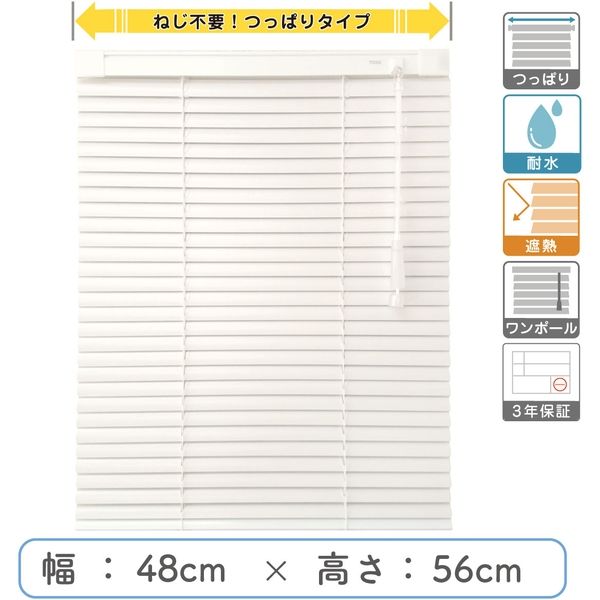 | 寸法 | 幅48cm×高56cm 操作棒48cm 取付け部分の奥行き2.9cm | 材質 | スラット、ヘッドボックス、レール:アルミ、ブラケット・ボトムカバー・キャップ:樹脂成形品 |