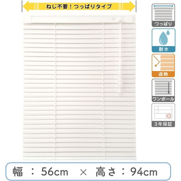 | 寸法 | 幅56cm×高94cm 操作棒48cm 取付け部分の奥行き2.9cm | 材質 | スラット、ヘッドボックス、レール:アルミ、ブラケット・ボトムカバー・キャップ:樹脂成形品 |