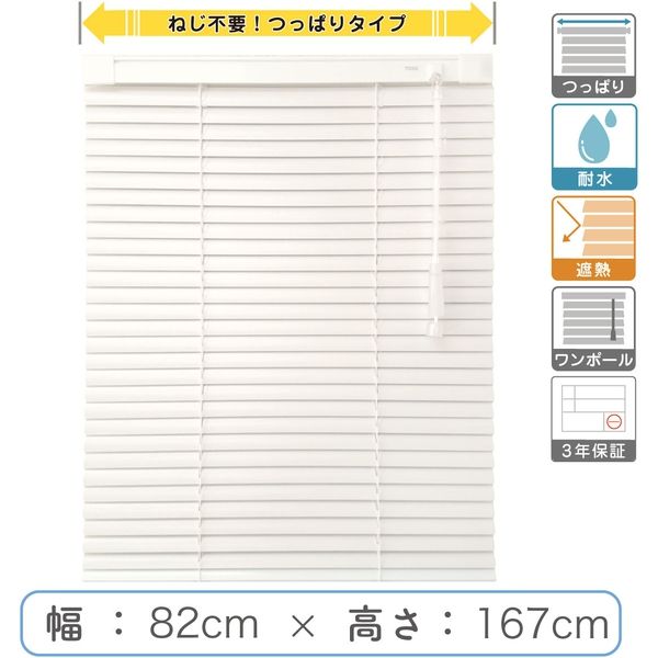 | 商品の特徴 | ブラインドは長く使うからこそしっかりとこだわったプロ仕様品質をそのままに、機能をシンプルにすることで格安価格を実現しました。遮熱加工済みで羽根幅は標準の25mm。取付けはネジのいらない【つっぱりタイプ】なのでタイル面でもご利用可能です。また耐水機能付きなので、サビやカビが気になる湿気の多い場所にもおすすめです。 | ||