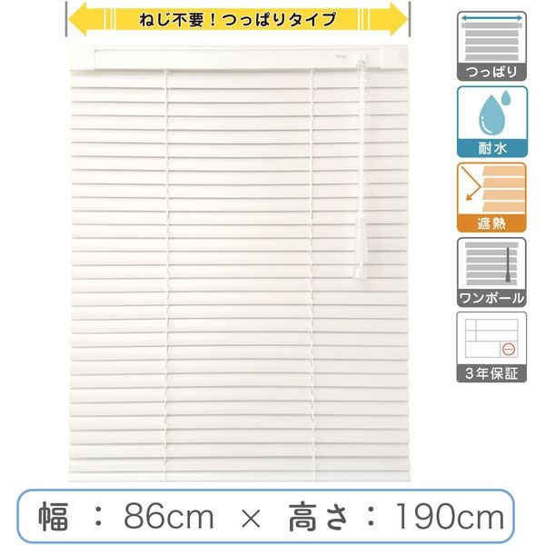 | 商品の特徴 | ブラインドは長く使うからこそしっかりとこだわったプロ仕様品質をそのままに、機能をシンプルにすることで格安価格を実現しました。遮熱加工済みで羽根幅は標準の25mm。取付けはネジのいらない【つっぱりタイプ】なのでタイル面でもご利用可能です。また耐水機能付きなので、サビやカビが気になる湿気の多い場所にもおすすめです。 | ||