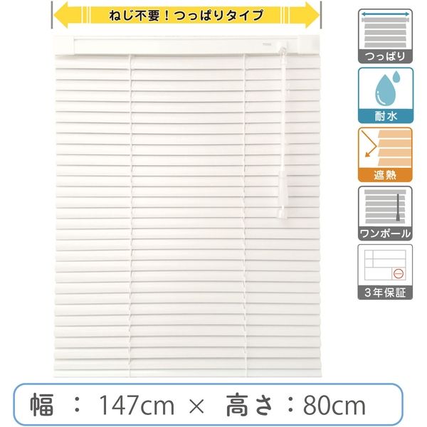 | 商品の特徴 | ブラインドは長く使うからこそしっかりとこだわったプロ仕様品質をそのままに、機能をシンプルにすることで格安価格を実現しました。遮熱加工済みで羽根幅は標準の25mm。取付けはネジのいらない【つっぱりタイプ】なのでタイル面でもご利用可能です。また耐水機能付きなので、サビやカビが気になる湿気の多い場所にもおすすめです。 | ||