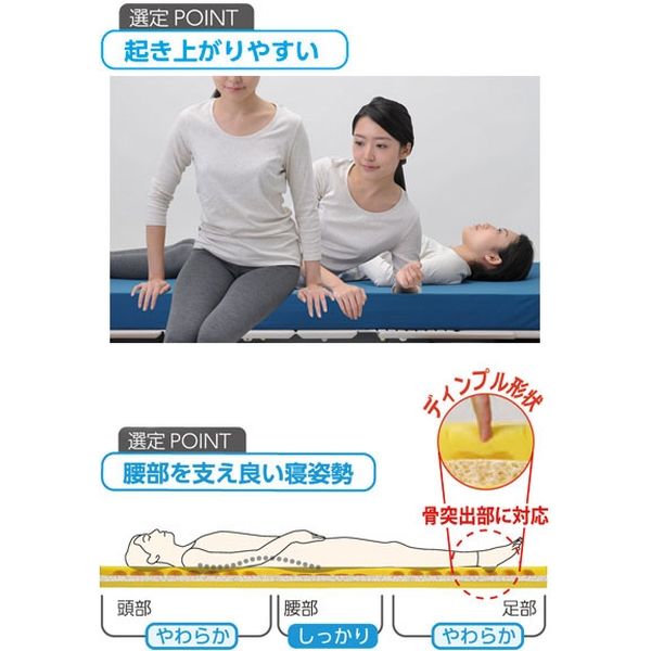 | 商品の特徴 | ・抜群の通気性、動きやすい安定性、優れた体圧分散性。療養者のQOLを高めるウレタンフォームマットレス。・熱や湿気がこもらないダブル通気。・起き上がりやすい。・腰部を支え良い寝心地(頭部:やわらか、腰部:しっかり、足部:やわらか)。・内部ディンプル形状により圧縮ではなく変形させることで反力を軽減。・衛生対策:丸洗いが可能。優れた速乾性。・優れた耐久性。 介援隊カタログ 介援隊コード:P0223 | ||