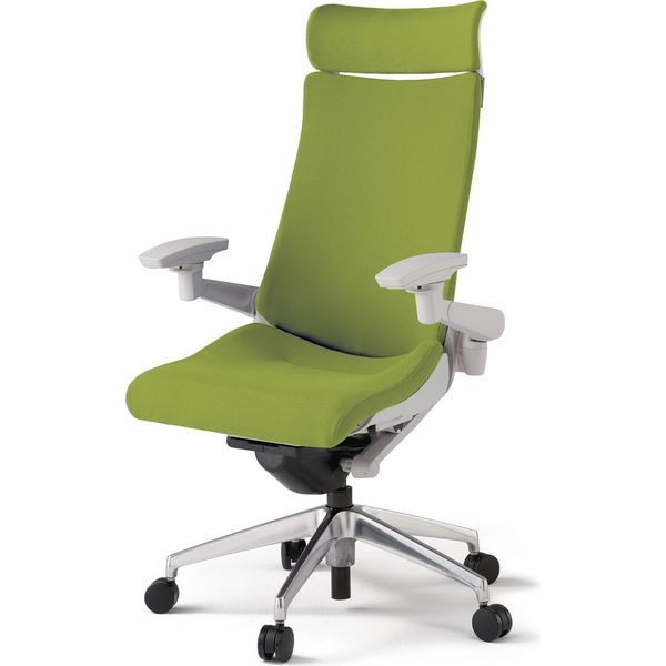 材質 背・座 :布地張り(再生ポリエステル63%・ポリエステル37%) 背ブラッケット:強化ナイロン樹脂 肘当て:発泡ウレタン一体成型肘受け:強化ナイロン樹脂脚:アルミダイキャストミラー仕上・抵抗付きウレタン双輪キャスター付き その他商品仕様 ●アンクルムーブ・シンクロロッキング:くるぶしを支点に背と座の角度が連動して傾き、背の最後傾角度は20°まで可能です。 またロッキングの角度を5カ所で固定できるシートアングルストッパー付です。●サイドフレームレスデザイン:アンカー形状の支柱で身体を支える構造により、両サイドのアウターフレームを不要にしたスマートなシルエット。肩から背中にかけて、背のサイド部分が柔軟なため、身体を動かしたときのストレスが軽減されます。●フレキブルバックレスト:しなやかに追従する、ピボット構造バックレストは、肩の動きに合わせて回転し、上半身をスムーズに動かすことができます。●ベンディングシート:座部のインナーシェル(芯材:ポリプロピレン樹脂製)には、最適な個所が着座荷重に応じて自在にたわむように多数のスリットを設けています。●座の奥行調節機構:座面下のレバー操作により、体格に合わせたポジショニング設定が座った状態でできます。座の前縁部が折れ曲がる方式の採用で、ベンディングシートの相性もさらによくなりました。(調節75mm)●調節レバー:すべて座面右下に配置。 (1)シートアングルストッパー: ロッキングの角度をお好みの場所で固定できます。(2)ガス上下調節:レバー操作により座面の高さ調節が行えます。(3)ロッキング強弱簡易調節:体格や好みに合わせて、ロッキングの強弱を5段階で簡単に調節できます。 ●ランバーサポート:背と腰を支えるランバーサポートは、S字カーブを描く理想的な姿勢をサポートし、腰の負担を軽減します。ランバーサポートの位置は、ワーカーの身体に合わせて60mm・7段階の調節が可能。背にもたれて荷重がかかることで固定されます。●執務姿勢に合わせて腕を支える4Dリンクアーム:肘当ては、上下・前後・回転角度ともに、調節範囲内をワンアクションで自在に動かすことができます。(調節範囲:高さ120mm、前後50mm、アーム回転内側20°/外側10°、肘パッド回転内側15°/外側15°)。常に作業に最適な肘位置を保持することで疲労を緩和。肘当て部はソフトな使い心地の発泡ウレタン樹脂を採用しています。●ベースカラー:ベースカラー ライトグレー(GN)脚:アルミミラー