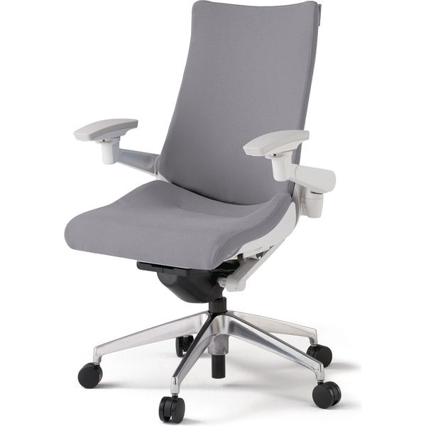 | 材質 | 背・座 :布地張り(再生ポリエステル63%・ポリエステル37%) 背ブラッケット:強化ナイロン樹脂 肘当て:発泡ウレタン一体成型肘受け:強化ナイロン樹脂脚:アルミダイキャストミラー仕上・ナイロン双輪キャスター付き | その他商品仕様 | ●アンクルムーブ・シンクロロッキング:くるぶしを支点に背と座の角度が連動して傾き、背の最後傾角度は20°まで可能です。 またロッキングの角度を5カ所で固定できるシートアングルストッパー付です。●サイドフレームレスデザイン:アンカー形状の支柱で身体を支える構造により、両サイドのアウターフレームを不要にしたスマートなシルエット。肩から背中にかけて、背のサイド部分が柔軟なため、身体を動かしたときのストレスが軽減されます。●フレキブルバックレスト:しなやかに追従する、ピボット構造バックレストは、肩の動きに合わせて回転し、上半身をスムーズに動かすことができます。●ベンディングシート:座部のインナーシェル(芯材:ポリプロピレン樹脂製)には、最適な個所が着座荷重に応じて自在にたわむように多数のスリットを設けています。●座の奥行調節機構:座面下のレバー操作により、体格に合わせたポジショニング設定が座った状態でできます。座の前縁部が折れ曲がる方式の採用で、ベンディングシートの相性もさらによくなりました。(調節75mm)●調節レバー:調節レバーはすべて座面右下に配置。 (1)シートアングルストッパー: ロッキングの角度をお好みの場所で固定できます。(2)ガス上下調節:レバー操作により座面の高さ調節が行えます。(3)ロッキング強弱簡易調節:体格や好みに合わせて、ロッキングの強弱を5段階で簡単に調節できます。 ●ランバーサポート:背と腰を支えるランバーサポートは、S字カーブを描く理想的な姿勢をサポートし、腰の負担を軽減します。ランバーサポートの位置は、ワーカーの身体に合わせて60mm・7段階の調節が可能。背にもたれて荷重がかかることで固定されます。●執務姿勢に合わせて腕を支える4Dリンクアーム:肘当ては、上下・前後・回転角度ともに、調節範囲内をワンアクションで自在に動かすことができます。(調節範囲:高さ=120mm、前後=50mm、アーム回転=内側20°・外側10°、肘パッド回転=内側15°・外側15°)。常に作業に最適な肘位置を保持することで疲労を緩和。肘当て部は、ソフトな使い心地の発泡ウレタン樹脂を採用しています。●ベースカラー:ベースカラー ホワイト(W9)脚:アルミミラー |