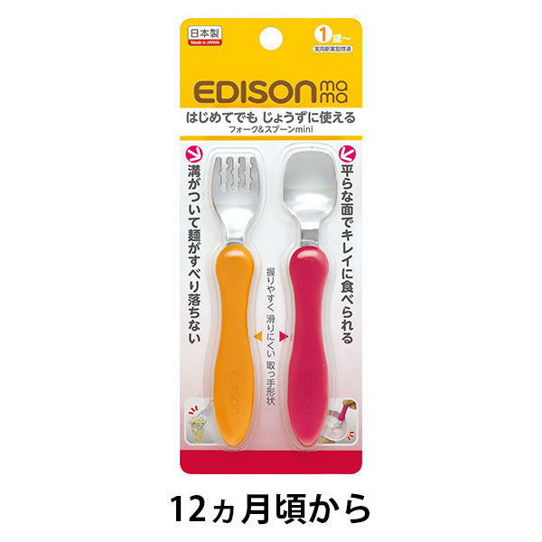 小さなお子様でも上手に食べられるエジソン独自の形状のフォーク&スプーン。