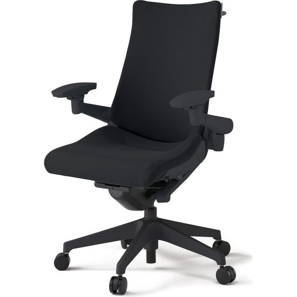 材質 背・座 :布地張り(再生ポリエステル63%・ポリエステル37%) 背ブラッケット:強化ナイロン樹脂 肘当て:発泡ウレタン一体成型肘受け:強化ナイロン樹脂脚:強化ナイロン樹脂 ・ナイロン双輪キャスター付き その他商品仕様 ●アンクルムーブ・シンクロロッキング:くるぶしを支点に背と座の角度が連動して傾き、背の最後傾角度は20°まで可能です。 またロッキングの角度を5カ所で固定できるシートアングルストッパー付です。●サイドフレームレスデザイン:アンカー形状の支柱で身体を支える構造により、両サイドのアウターフレームを不要にしたスマートなシルエット。肩から背中にかけて、背のサイド部分が柔軟なため、身体を動かしたときのストレスが軽減されます。●フレキブルバックレスト:しなやかに追従する、ピボット構造バックレストは、肩の動きに合わせて回転し、上半身をスムーズに動かすことができます。●ベンディングシート:座部のインナーシェル(芯材:ポリプロピレン樹脂製)には、最適な個所が着座荷重に応じて自在にたわむように多数のスリットを設けています。●座の奥行調節機構:座面下のレバー操作により、体格に合わせたポジショニング設定が座った状態でできます。座の前縁部が折れ曲がる方式の採用で、ベンディングシートの相性もさらによくなりました。(調節75mm)●調節レバー:調節レバーはすべて座面右下に配置。 (1)シートアングルストッパー: ロッキングの角度をお好みの場所で固定できます。(2)ガス上下調節:レバー操作により座面の高さ調節が行えます。(3)ロッキング強弱簡易調節:体格や好みに合わせて、ロッキングの強弱を5段階で簡単に調節できます。 ●ランバーサポート:ランバーサポート無●肘:執務姿勢に合わせて腕を支える4Dリンクアーム:執務(集中姿勢)肘当てを身体に近い位置へ動かすことができるため、デスクトップPC、ノートPC操作の時に肘をしっかりと支えて自然な姿勢で作業をすることができます。執務(リラックス姿勢)肘当てを後方に動かすことができるため、タブレット、スマートフォン操作の時に、背にもたれ、リラックスした状態で作業をすることができます。肘当ては、上下・前後・回転角度ともに、調節範囲内をワンアクションで自在に動かすことができます。(調節範囲:高さ=120mm、前後=50mm、アーム回転=内側20°・外側10°、肘パッド回転=内側15°・外側15°)。常に作業に最適な肘位置を保持することで疲労を緩和。肘当て部は、ソフトな使い心地の発泡ウレタン樹脂を採用しています。●ベースカラー:ベースカラー ブラック(T1)