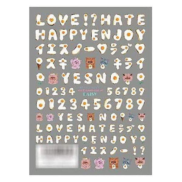 - 目玉焼きをフォントにしたDAISY定番アート。焦げ目までしっかり描き込まれたリアルで可愛い目玉焼きモチーフです!LOVEやHATE、イエスにノー!目玉焼きで可愛いく指先にメッセージを忍ばせてみませんかイングカワモトのネイルシールについて。■レジンシールとの違いは特徴1:素材が違う、シールにカットラインが入っているため使いやすい。2:ネイルシールの方が厚みが薄く柔らかいため爪のような曲面に貼りやすい。3:レジンシールは両面印刷だがネイルシールは片面印刷です。4:レジンシールに比べて柄が小さい分1枚に対してのシールの量が多いです。※注意点:市販のマニキュアだと成分が反応してシワが寄る剥がれる等の現象がおきるためジェルネイル専用となります。