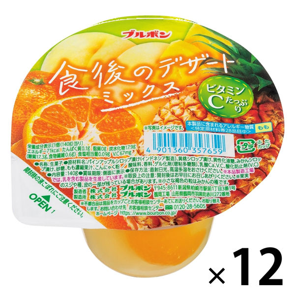 | 内容量 | 140g | その他商品仕様 | ●原材料名/添加物名:パインアップルシロップ漬け(インドネシア製造)、黄桃シロップ漬け、異性化液糖、みかんシロップ漬け、砂糖、もも濃縮果汁、こんにゃく粉/酸味料、香料、ゲル化剤(増粘多糖類)、乳酸Ca、V.C、酸化防止剤(V.C) |