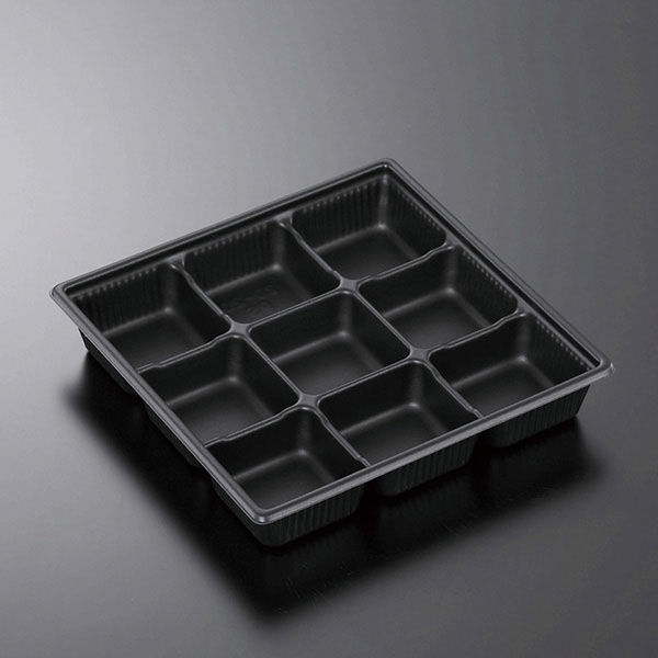 | 商品の特徴 | 9種の惣菜を盛り付けできる容器です。蓋は別売です。●容量:40g×9●電子レンジ使用可●オーブン使用不可●耐油性:あり●耐熱温度:130℃●入数:50枚 | ||