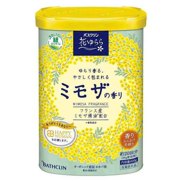 - ミモザのかわいらしいふわふわの黄色い花とやさしい香りでいやされる入浴剤です。女性の活躍を応援するプロジェクト HAPPY WOMAN 支援商品 こだわりのミモザの香り・南フランス(ミモザ街道)に咲くミモザの香りをイメージ・フランス産のミモザ精油をブレンド(香料成分)・天然アロマビーズを用いることで香りふんわり長続き 温泉ミネラル成分配合(乾燥硫酸ナトリウム)・温浴効果を高めて、血行を促進、毎日の疲れ・冷え・肩こり・腰痛に効果的 肌当たりまろやか・オーガニック認証ホホバ油(保湿成分)配合・アミノ酸成分で水道水中の塩素を除去し、まろやかなお湯に●ミモザの花をイメージしたミモザイエロー色(透明タイプ)のお湯○バスクリン品質対応○環境にやさしい紙パッケージ