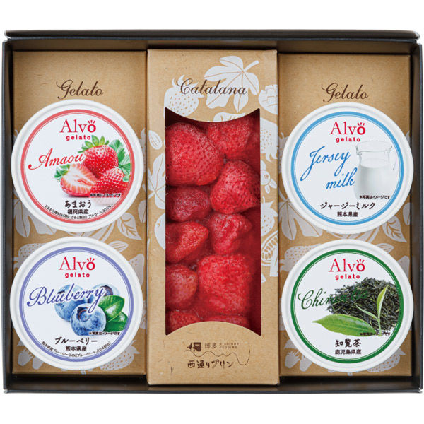 | 備考 | 【返品について】お客様のご都合による返品はお受けできません。西通りプリン一番人気のカスタードプリン「ポシェ」をベースに福岡県産あまおう苺のコンポートをトッピングした『あまおうカタラーナ』と、熊本県産牛乳を使用したコクのある『ジャージーミルクジェラート』、福岡県産あまおう苺を使用した『あまおうジェラート』、熊本県産ブルーベリーを使用した『ブルーベリージェラート』、鹿児島県産知覧茶を使用した『知覧茶ジェラート』のセットです。 | ||