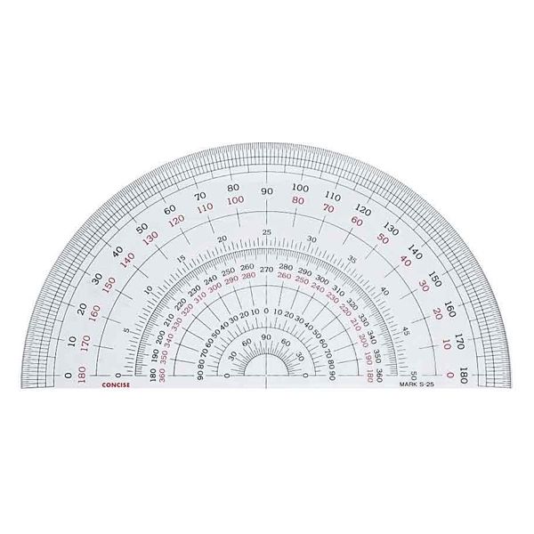 商品の特徴 直径25cmの大型の半円分度器です。外側に0.5度の目盛が入っているので細かな計測が可能です。定規の内部にも目盛があるため、小さな物でも測りやすい仕様です。定規の厚さは3mmで、押さえやすいのも特徴です。