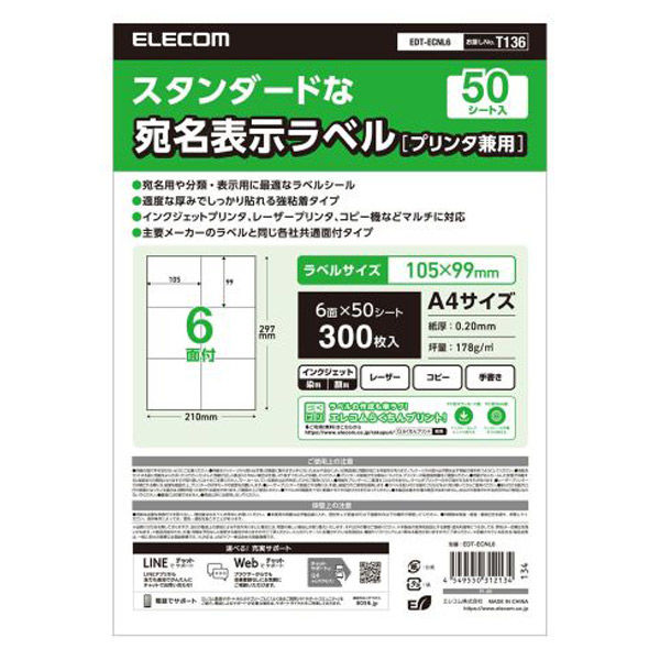 エレコム ラベルシール 表示・宛名ラベル プリンタ兼用 マット紙 A4 6面 1袋 (50シート) 白 EDT-ECNL6