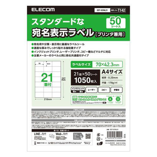 エレコム ラベルシール 表示・宛名ラベル プリンタ兼用 マット紙 A4 21面 1袋 (50シート) 白 EDT-ECNL21