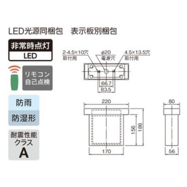 | 商品の特徴 | ルクセント LEDsシリーズ 防雨防湿形 C級(10形) 天井直付形 片面灯 電池内蔵形※表示板は別売 | ||
