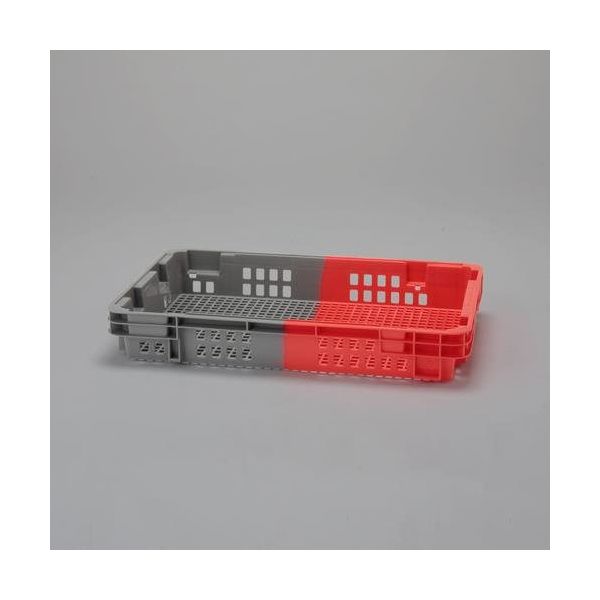 ●180°回転により同色でスタッキング2色コンテナ(SNコンテナ)で採用されているタイプで、同色・同形状スタッキングタイプとも言います。製品を水平に180°回転させることで、スタッキング(積み重ね)とネスティング(収納)の二つの形態がとれるタイプです。スタッキング時は商品を収納しての搬送や保管に利用できます。空箱時はネスティングさせることで、容積を小さくでき、空箱の保管場所や運送費の削減が可能です。スタッキング時の耐荷重性を重視した設計で、段積み時の強度に優れています。製品詳細スペック内の「圧縮荷重」(スタッキングした製品の最大圧縮荷重を示しています。その値を4で割った数値以内をご使用の目安としてください)をご確認ください。●両短辺ラベル剥離用リブ有●積み重ね可能