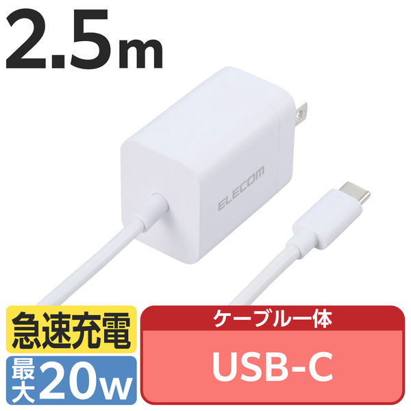 USB充電器 PD 20W タイプC ケーブル一体型 2.5m ホワイト MPA-ACCP7020WH エレコム 1個
