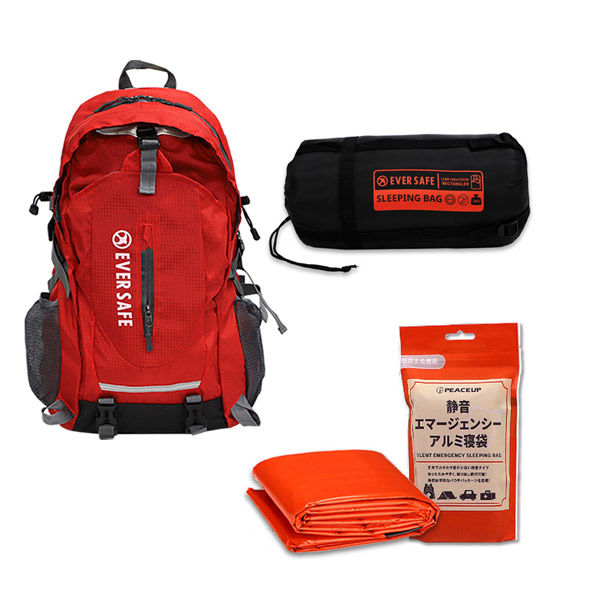 【各5個セット】多機能リュック(レッド)+封筒型寝袋(ブラック)+静音アルミ寝袋 40-45L シュラフ 避難 災害 EVERSAFE(直送品)