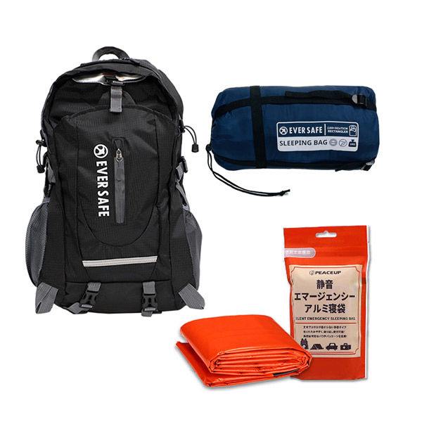 【各10個セット】多機能リュック(ブラック)+封筒型寝袋(ネイビー)+静音アルミ寝袋 40-45L シュラフ 避難 災害 EVERSAFE(直送品)