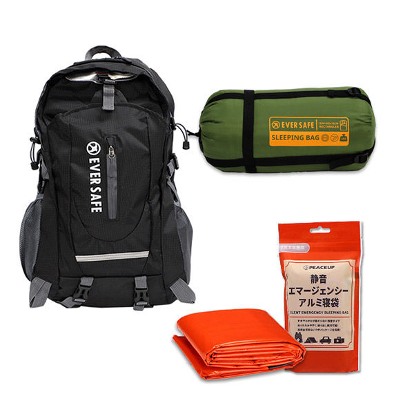 【各10個セット】多機能リュック(ブラック)+封筒型寝袋(カーキ)+静音アルミ寝袋 40-45L シュラフ 避難 災害 EVERSAFE(直送品)