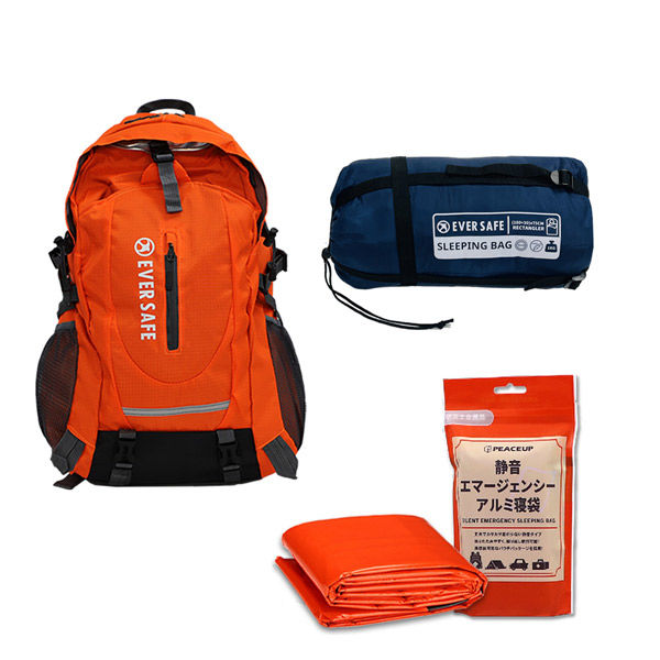 【各10個セット】多機能リュック(オレンジ)+封筒型寝袋(ネイビー)+静音アルミ寝袋 40-45L シュラフ 避難 災害 EVERSAFE(直送品)