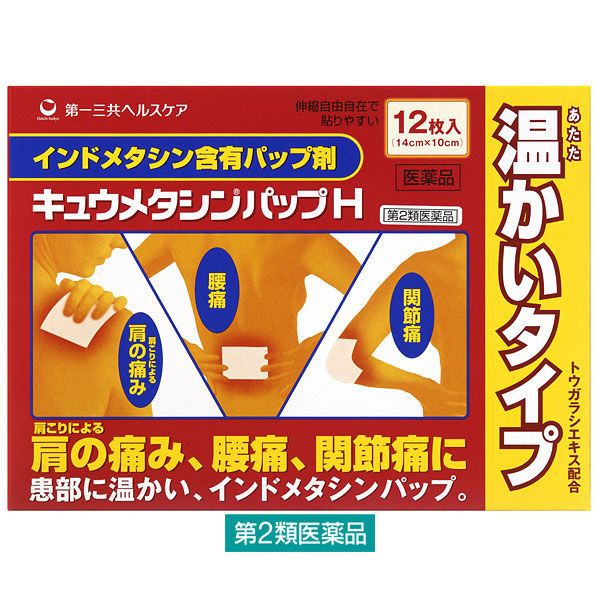 つらい肩こり痛、腰痛に。 キュウメタシンパップHは、鎮痛消炎成分(インドメタシン)に加え、トウガラシエキスを配合した温かいタイプです。サイズ10cmX14cm 冷えるとつらくなる慢性的な肩こり痛や腰痛に向いています。 【効能・効果】 腰痛、関節痛、腱鞘炎(手・手首の痛み)、肘の痛み(テニス肘等)、筋肉痛、打撲、捻挫、肩こりによる肩の痛み