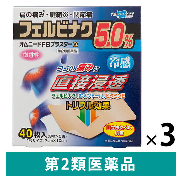 フェルビナクを5.0%配合した鎮痛・消炎テープ剤。 オムニード FBプラスターα 冷感は、鎮痛成分フェルビナクに加え、ビタミンE(トコフェロール酢酸エステル)が末梢の血流を促進し、更に、l-メントールの働きで心地よい冷感刺激があり、3成分のトリプル効果で痛みをやわらげます。 目立ちにくい肌色の基布を使用した痛み止めの貼り薬。微香性。 【効能・効果】 肩こりに伴う肩の痛み、腰痛、関節痛、筋肉痛、腱鞘炎(手・手首・足首の痛みと腫れ)、肘の痛み(テニス肘など)、打撲、捻挫。 【16枚/箱 / 40枚/箱】各種