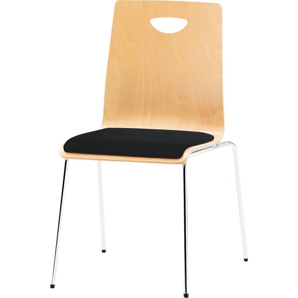 表面にブナ材を使用した、木目のあたたかみがあるスタッキングチェア。座面にはウレタンのクッションがついています。張り地は防汚・光触媒加工をした布で、汚れや菌、においがつきにくくなっています。スタンダードな4本脚タイプ。