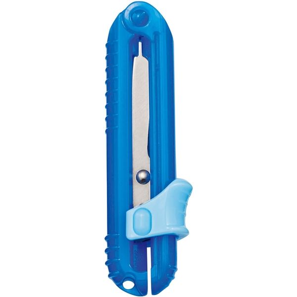片手で刃が出せる携帯はさみ。刃渡り3.3cmサイズ。キャップ不要で、収納時は刃がスライドして中に納まる。