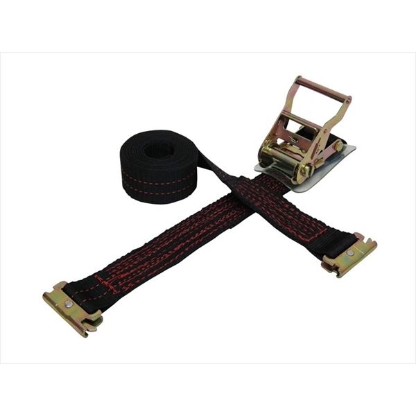 ラチェットバックル式のタイダウンベルト、握り易いバックルと柔軟強度な繊維ベルトで荷に優しく簡単安全に荷締め作業ができます。