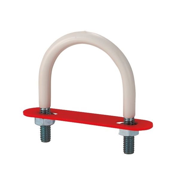 電気絶縁用のUボルト。軟質塩ビコーティングタイプ。SGP管用。電気絶縁性に優れ、管の表面を支持金具の接触により発生する細かな傷から守ります。軟質塩ビの物性上、常温80℃までの屋内配管にご使用ください。