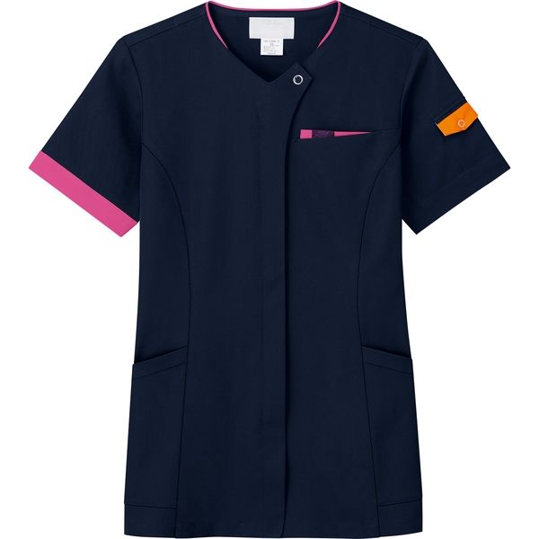 背面の仕様が、色が落ちない特殊な糸を使用したストレッチ性のあるニット素材になっている前センターファスナー男女兼用スクラブです。胸ポケットにはiPhone・ペン入れなど対応できる2重ポケット付き、配色使いがデザインのポイントになっています。また、左袖の蛍光フラップのついたポケットはICカードが収まるサイズになっていて、両手が荷物いっぱいでふさがっている時でも袖を近づけるだけで打刻することもおすすめポイントです。