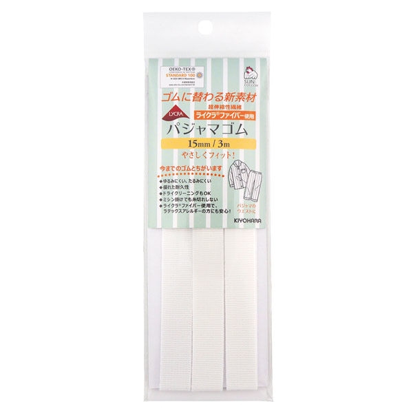 やさしい肌あたり、ライクラRパジャマゴム。伸びる繊維、ライクラRファイバーを採用。洗濯・ドライクリーニングに強い。ゆるみにくく、たるみにくく、優れた耐久性。サラっとした肌あたり。しなやかな伸縮性で跡が残りにくい。ミシンがけでも繊維が切れない。