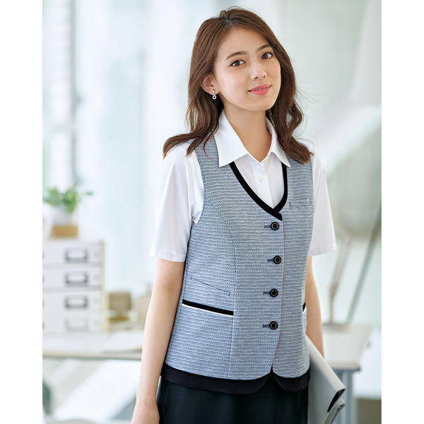 涼しげな色合いとさりげないボーダー柄が夏らしいベスト。消臭・制菌加工「デオファクター(R)」を施し、通気性に優れています。少し長めの着丈によりかがんでも背中が見えにくく、パンツスタイルにも最適な丈バランス。やや高めのウエスト位置は足長効果があり、配色切替とボタンが全体の印象を引き締めます。襟見返しにアクセサリーホルダーが付いており、胸ポケットにはネームホルダーが取り付け可能。右脇ポケットにスマホも入るチェンジポケット、左腰ポケットは名刺も入るダブルポケットです。家庭洗濯が可能です。