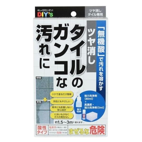 【特長】安全な「無機酸」を配合した業界初の凹凸のあるタイル(ツヤ消しタイル)専用の洗浄剤です。汚れを溶かす安全な「無機酸」、汚れに浸透する「有機酸」、汚れを浮かせて引きはがす「界面活性剤」の相乗効果により、頑固な汚れを落とします。ハケで塗ったり、メラミンスポンジでこするだけで簡単に作業できます。手に触れても安心安全。草木にも影響しない安全設計です。※目立たないところで試してからお使いください。【用途】凹凸のあるタイルの頑固汚れに最適な洗剤です。