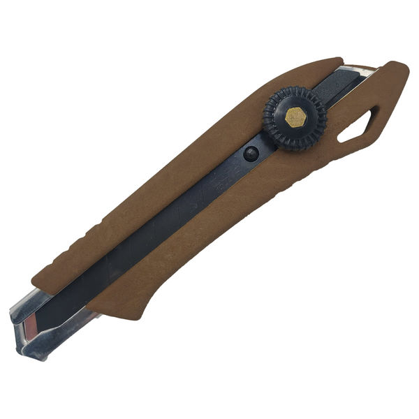 手にしっかりフィットし、手汗や油で滑りにくい!新感覚のノンスリップカッターナイフ。樹脂に木粉を混合した複合材料「木樹脂」、木の風合いを感じながらも優れた強度を兼ね備えます。安心のオルファ製特専黒場を標準装着。黒刃は通常刃よりも鋭角に研磨しており、初期の切れ味と入り込みの良さが特徴です。本体後部に設けた穴には、落下防止用コードやカラビナなどの金具を取り付けることができ、安全管理が厳しく求められる様々な作業環境で活躍します。