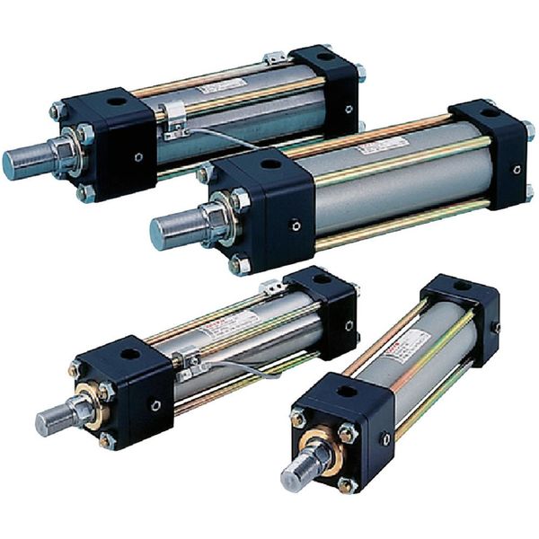 内径φ32~φ250までの14MPa用複動油圧シリンダ。高性能クッションの採用により停止時のショックが小さくなりました。クッションバルブは、安全対策として、抜け止め機構、およびゆるみ止め用ロックナットを採用しました。
