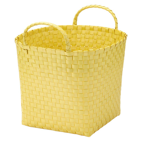 荷物をまとめる梱包用のバンドで編んだバスケットです。丈夫で水に強く、汚れても洗い流せるので屋外に持ち出して使うこともできます。